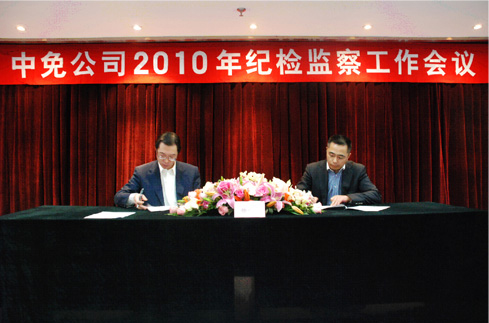 本次會(huì)議的主題是深入貫徹中紀(jì)委十七屆五次全會(huì)、國資委和國旅集團(tuán)2010年紀(jì)檢監(jiān)察工作會(huì)議精神,總結(jié)公司2009年黨風(fēng)建設(shè)和反腐倡廉工作,提出2010年工作要求,由公司黨委書記盧路分別與公司經(jīng)營班子成員和部門以上負(fù)責(zé)人、在京子公司主要負(fù)責(zé)人簽訂2010年《廉潔從業(yè)責(zé)任書》。